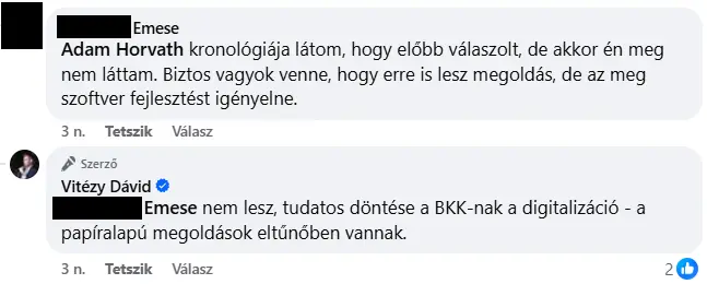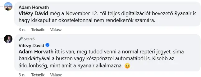 Egy optimista Facebook-kommentelő azon hozzászólására, hogy biztosan lesz majd megoldás arra, hogy automatában is meg lehessen vásárolni az 1000 forintos jegyet a 100E Repülőtéri Expressz járatra, Vitézy azt írta: