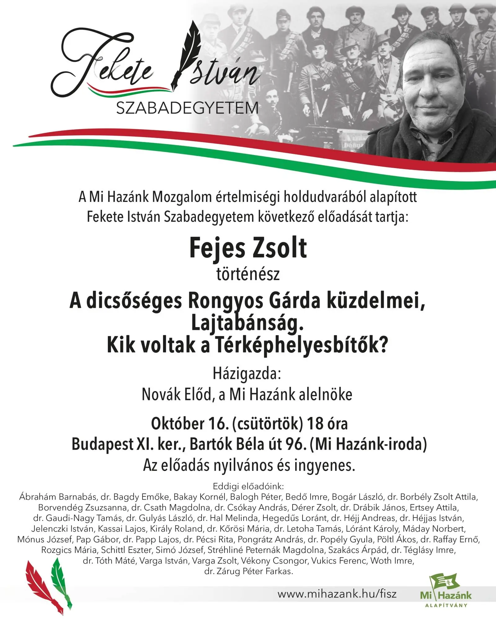A Mi Hazánk Mozgalom értelmiségi holdudvarából alapított Fekete István Szabadegyetem következő előadását Fejes Zsolt történész tartja A dicsőséges Rongyos Gárda küzdelmei, Lajtabánság. Kik voltak a Térképhelyesbítők? címmel.
