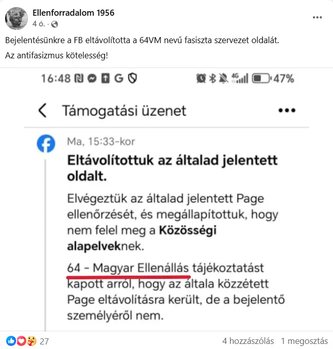 „Bejelentésünkre a FB eltávolította a 64VM nevű fasiszta szervezet oldalát. Az antifasizmus kötelesség!” – írta a feljelentés kommunista hagyományait őrző Munkásőr Emléktársasághoz köthető Ellenforradalom 1956. Az oldal törlése kapcsán elértük a HVIM társvezetőjét, Barcsa-Turner Gábort.