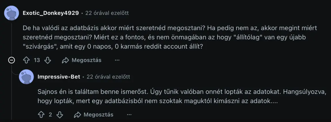 A törölt poszt 19 hozzászólást élt meg, ezek viszont továbbra is olvashatóak. Ebben egy felhasználó hangot ad a véleményének, miszerint nem hiszi, hogy valósak az adatok, mire egy válaszoló azt állítja, ismerőst is talált benne, szerinte hitelesek az adatok. Viszont meggyőződése, hogy azokat ellopták: