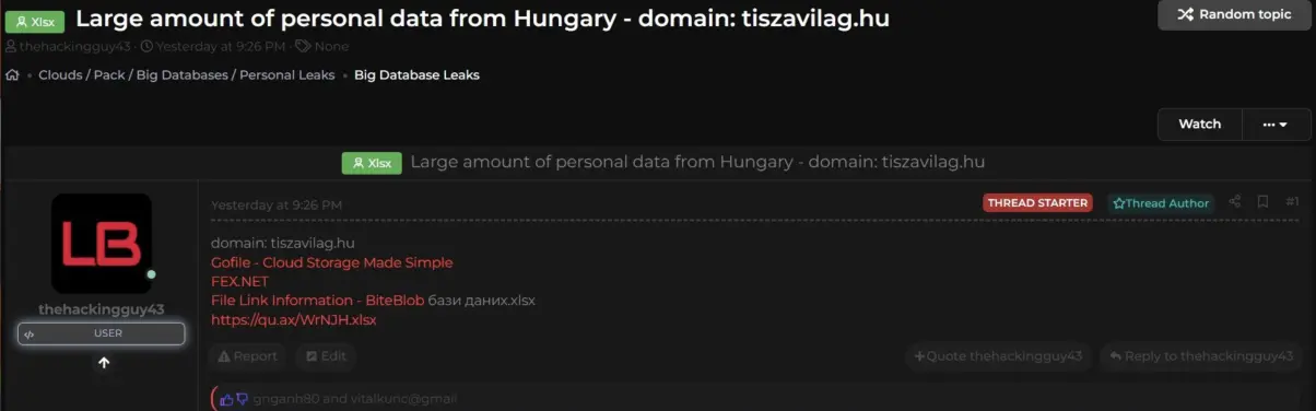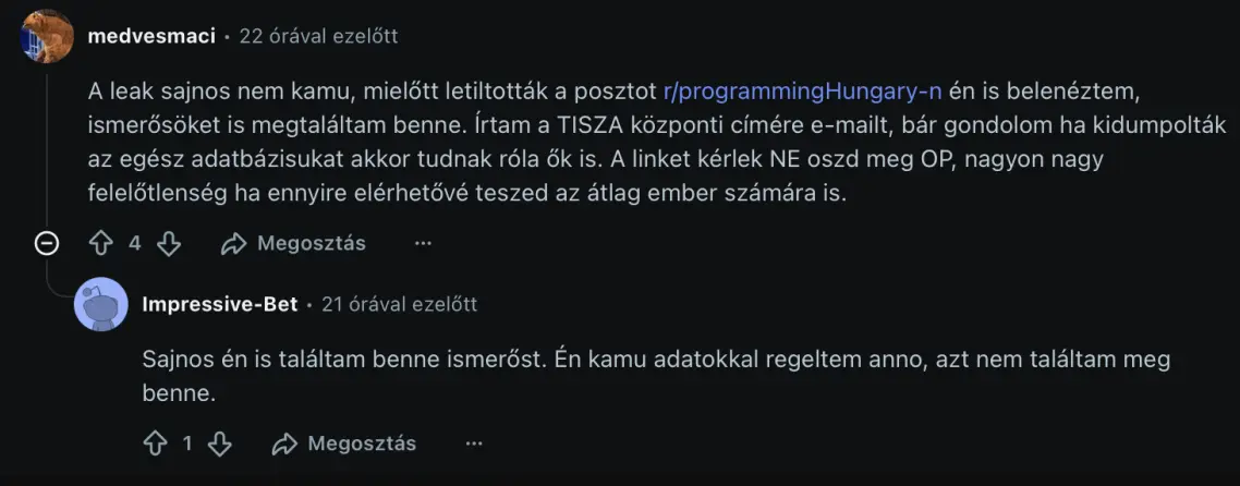 „A leak (sic!) sajnos nem kamu, mielőtt letiltották a posztot r/programmingHungary-n én is belenéztem, ismerősöket is megtaláltam benne. Írtam a Tisza központi címére e-mailt, bár gondolom ha kidumpolták (sic!) az egész adatbázisukat akkor tudnak róla ők is. A linket kérlek NE oszd meg, OP, nagyon nagy felelőtlenség, ha ennyire elérhetővé teszed az átlag ember számára is” – így egy másik tiszás.