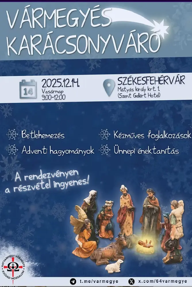 A vármegyés karácsonyváróra 2025. december 14-én (vasárnap) délelőtt 9:00 és 12:00 óra között a székesfehérvári Szent Gellért Hotelben kerül sor.