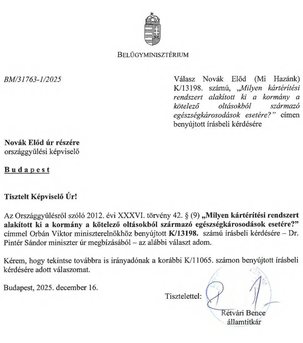 Jelenleg azonban nem ismert olyan állami, átlátható, előre rögzített szabály- és garanciarendszer, amely kifejezetten a kötelező védőoltásokból eredő súlyos egészségkárosodás vagy maradandó rokkantság esetén gyors, pereskedés nélküli, egységes eljárás keretében biztosítana kártalanítást”
