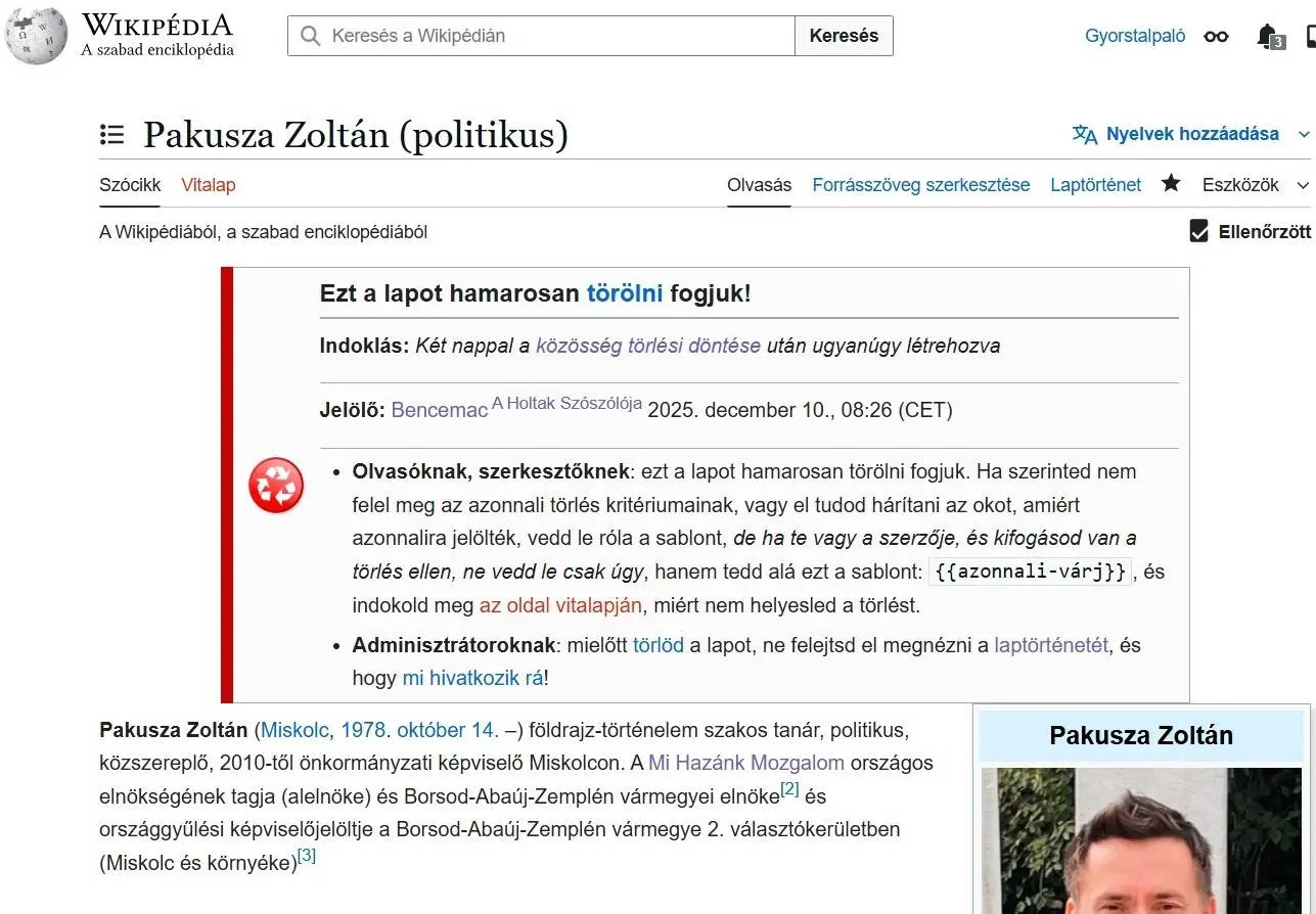Hiszen pl. annak a Pakusza Zoltánnak a szócikkét is törölték, aki a Mi Hazánk országos alelnöke, önkormányzati kabinetvezetője, Miskolc egyéni győztes települési képviselője (15 éve a miskolci közgyűlés tagja), hazánk harmadik legerősebb pártjának vármegyei elnöke is. Törölték dr. Fiszter Zsuzsanna Wikipédia-oldalát is, aki a Mi Hazánk országszerte ismert, a végrehajtó maffia lebuktatásában élen járó szakpolitikusa, a párt Gazdasági Kabinetjének elnöke is.