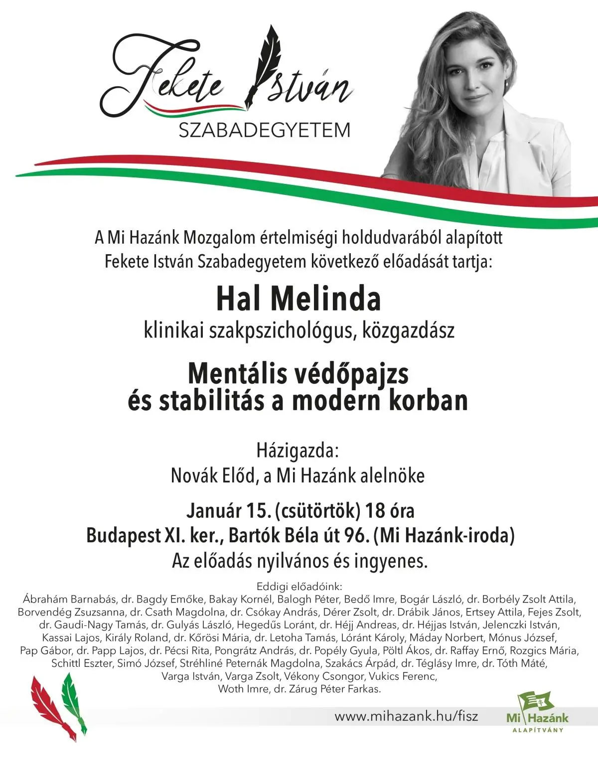 A Mi Hazánk értelmiségi holdudvarából alapított Fekete István Szabadegyetem soron következő előadását Hal Melinda klinikai szakpszihológus, közgazdász tartja. Az előadás címe: „Mentális védőpajzs és stabilitás a modern korban”.