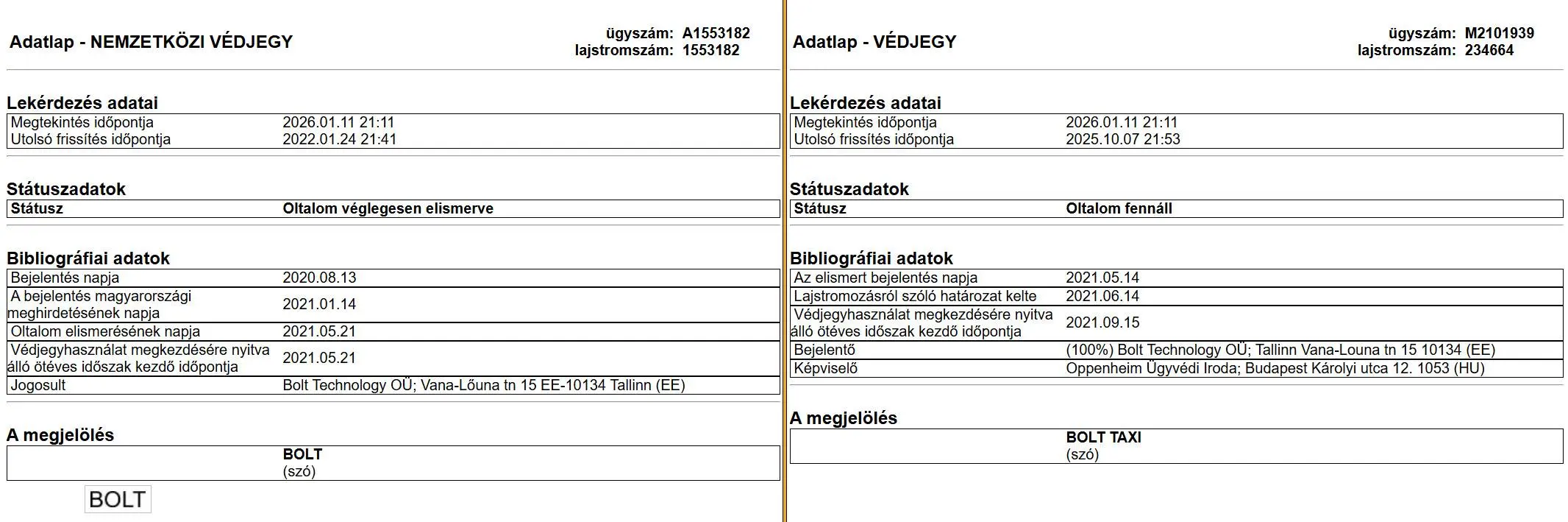 A Boltnál azonban különös dologra lehetünk figyelmesek. Az észt Bolt (Bolt Technology OÜ) nevén szerepel két védjegyoltalmi bejegyzés, ám mind a kettő csupán szóra vonatkozik. Tehát az észtországi vállalat effektíve levédette személyszállítással kapcsolatban kizárólagos használatra a „BOLT”, illetőleg a „BOLT TAXI” szavakat.