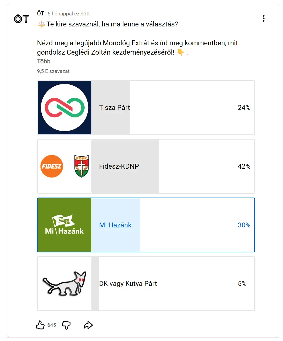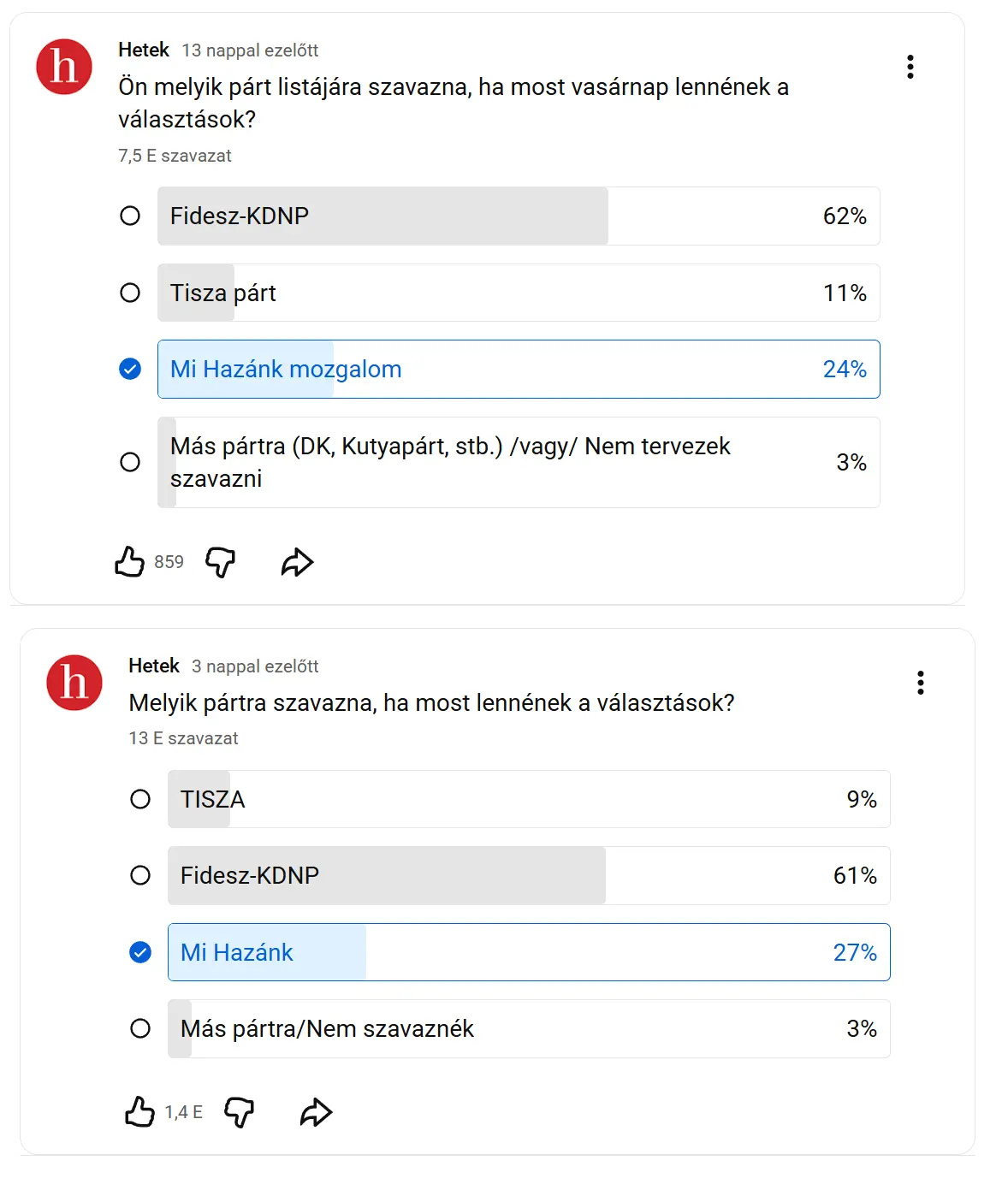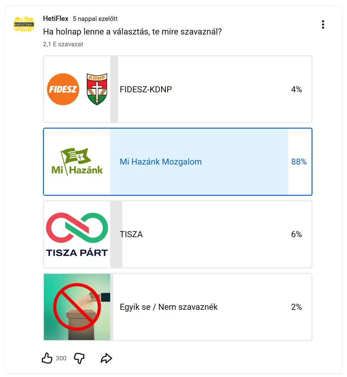 A YouTube közösségi fülén több magyar YouTube-csatorna is szavazást hirdetett azzal kapcsolatban, hogy melyik pártot választanák a nézők, ha most kellene voksolniuk. Bár a csatornák nézőinek elolszlása változó lehet, azért a számok annyit elárulnak, hogy a magyar YouTube-nézők erősen szimpatizálnak a Mi Hazánk Mozgalommal. Nem véletlenül örvend nagy népszerűségnek a Bűnvadászok és Toroczkai László, a Mi Hazánk Mozgalom elnökének YouTube-csatornája is. A jelenség újabb indikátora lehet annak, hogy a közvélemény-kutatók rendszeresen alulmérik a Mi Hazánk támogatóinak számát.