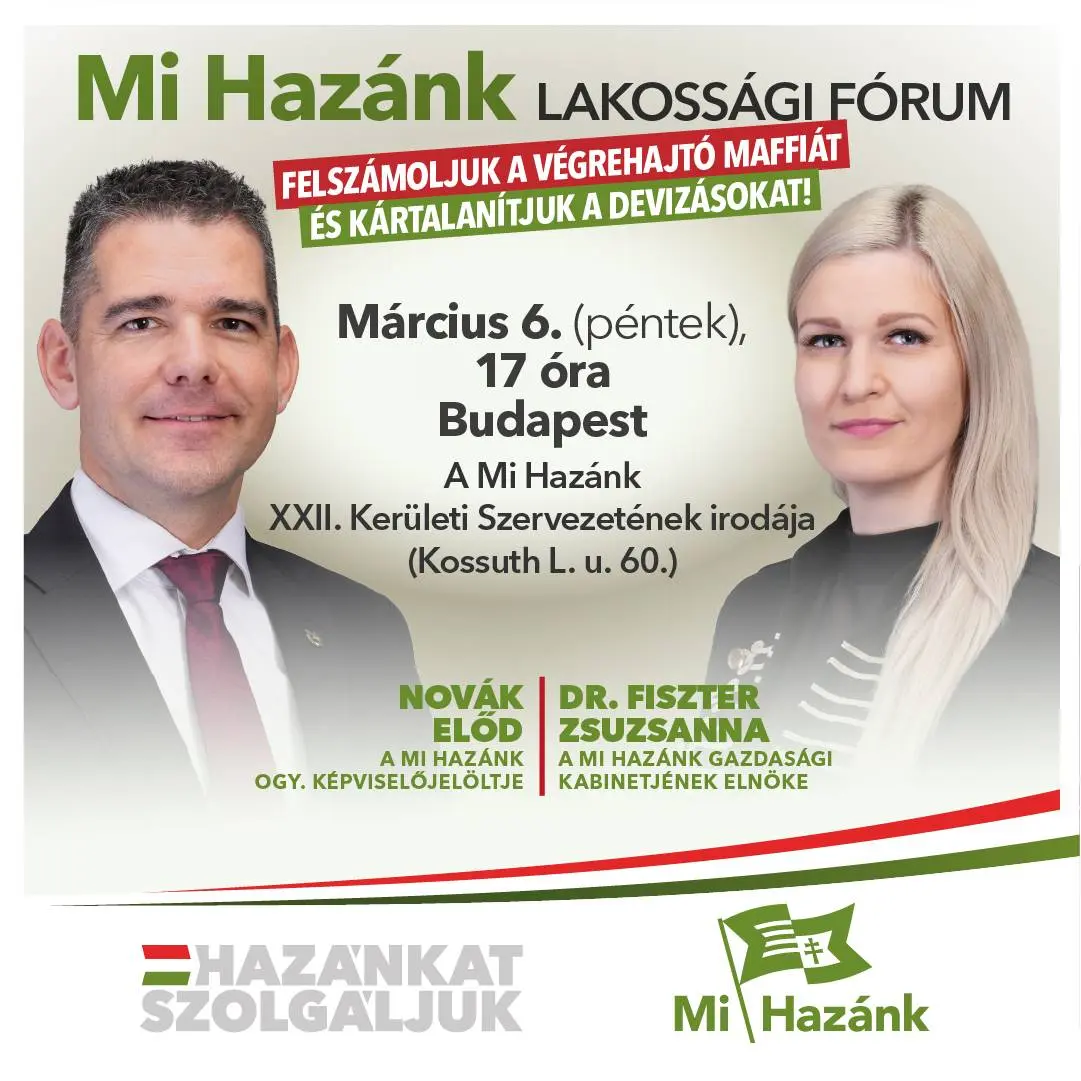 Dr. Fiszter Zsuzsanna, a Mi Hazánk Mozgalom Gazdasági Kabinetjének elnöke és Novák Előd, a Mi Hazánk Mozgalom alelnöke lakossági fórumot tart Budapesten, ahol bemutatják a párt javaslatait a végrehajtó maffia felszámolására, valamint a devizahitelesek kártalanítására.