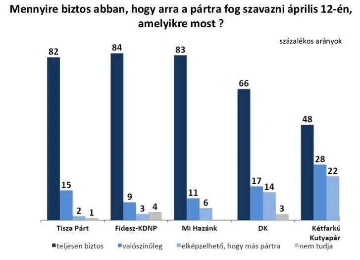 A Tiszához és a Fideszhez hasonlóan a Mi Hazánk szavazói is rendkívül elkötelezetten kitartanak választásuk mellett, míg a háttérbe szorult DK és a többi kis párt tábora egyre jobban elbizonytalanodik. Ebben minden bizonnyal nagy szerepet játszik, hogy április 12-e után nagy valószínűséggel hárompárti Országgyűlés lesz. A három biztosan parlamentbe kerülő párton kívül eddig egyedül a parlamenti küszöb körül imbolygó DK tudott országos listát állítani, és várhatóan semelyik másik párt nem fog tudni – az elveszett szavazatok pedig meglehetősen elbizonytalaníthatják ezen pártok maradék támogatóit is.