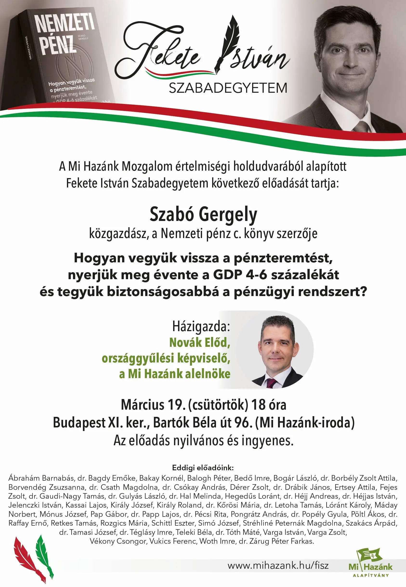 Immár több mint ötven előadó vett részt a Mi Hazánk Mozgalom értelmiségi holdudvara által létrehozott rendezvénysorozatában. A legújabb előadást Szabó Gergely közgazdász, a Nemzeti pénz című könyv szerzője tartja. Előadásában arra a kérdésre keresi a választ, miként lehetne visszaszerezni a pénzteremtés lehetőségét, hogyan nyerhetne ezzel Magyarország évente a GDP 4-6 százalékának megfelelő összeget, valamint miként válhatna biztonságosabbá a pénzügyi rendszer.