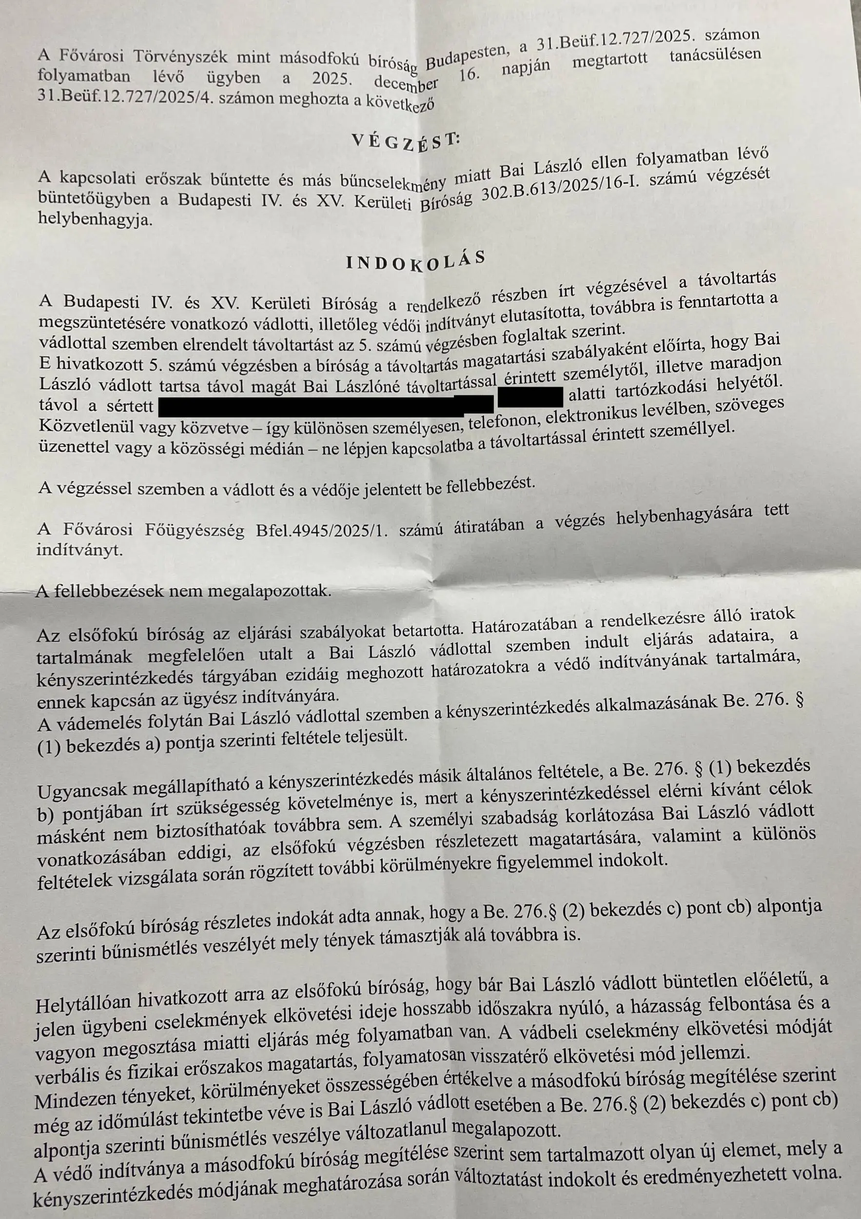 távoltartási végzést rendelt el Bai Lászlóval szemben, amit a másodfokon eljáró Fővárosi Törvényszék 2025. december 16-án meghozott végzése fenntartott.