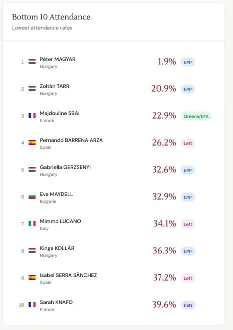 Az oldal külön rangsorolja a tíz leginaktívabb képviselőt, akik közül sajnos négyen is magyar zászlóval a nevük mellett rontják hazánk hírnevét. Mind a négyük kivétel nélkül a Tisza Párt képviselője.