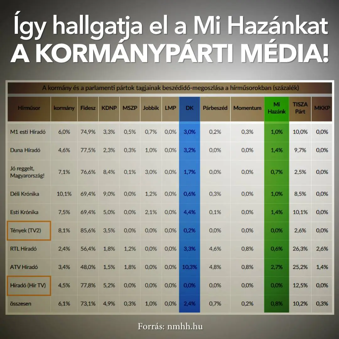 A politikus azt írta, hogy az NMHH legfrissebb kimutatása szerint a HírTV és a szintén fideszes TV2 híradóiban egy teljes hónap alatt is 0,0 százalék volt a Mi Hazánk megjelenési aránya. Hozzátette, hogy a közmédiában is hasonló a helyzet. Egyedül az ATV-n kapott nagyobb, 2,7 százalékos megjelenést a párt, ami persze még mindig messze a társadalmi támogatottsága alatt van.