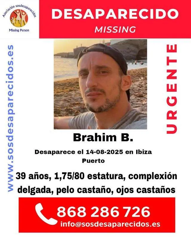 - Brahim B., 39 éves férfi, augusztus 14‑én tűnt el Ibizán. Utolsó megbízható nyoma szerint Puerto de Ibiza (Ibiza kikötője) környékén. Nem találtunk információt arról sem, hogy hogyan tűnt el.