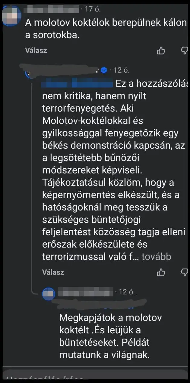 Egy másik hozzászóló figyelmeztette, hogy ez nem kritika, hanem nyílt terrorfenyegetés, ráadásul egy békés demonstrációval kapcsolatban. Hozzátette, hogy megteszik a büntetőfeljelentést közösség tagja elleni erőszak előkészülete és terrorizmussal fenyegetés miatt. Az elkövető azonban jelezte, hogy ez nem riasztja el: