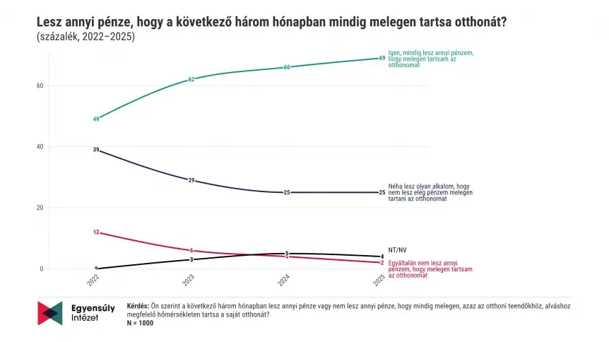 A helyzet meglehetősen javult a 2022-es energiaválsághoz képest: akkor a megkérdezettek 39 százaléka eseti nehézségekkel küzdött, 12 százalék pedig úgy nyilatkozott, lehetetlennek tartja lakása melegen tartását.