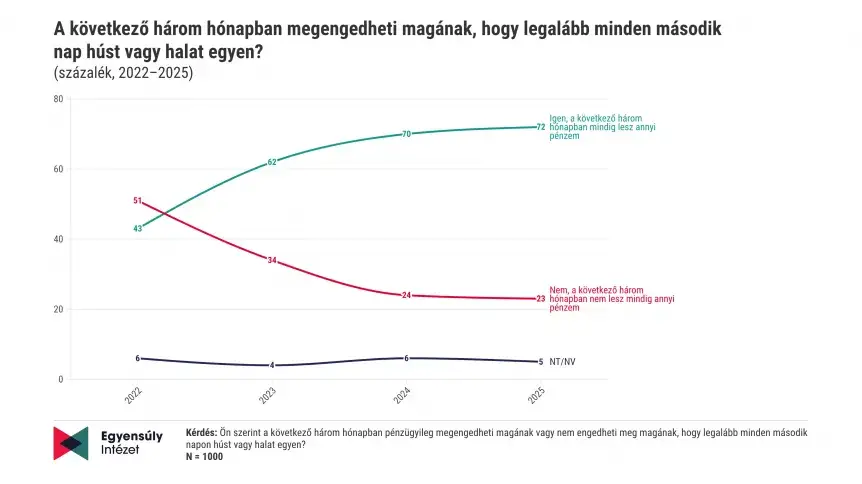 A kutatásban arra is rákérdeztek, a magyarok hány százalékának lesz annyi pénze a következő három hónapban, hogy legalább minden második nap húst vagy halat ehessen. A lakosság 72 százalékának lesz erre elég anyagi forrása, 23 százaléknak viszont nem mindig lesz rá lehetősége. 2022-höz képest ezen a téren is látványos javulás következett be, három évvel ezelőtt csupán a 43 százaléka tudott minden második nap húst vagy halat enni, a lakosság több mint felének viszont nem volt erre elég bevétele.