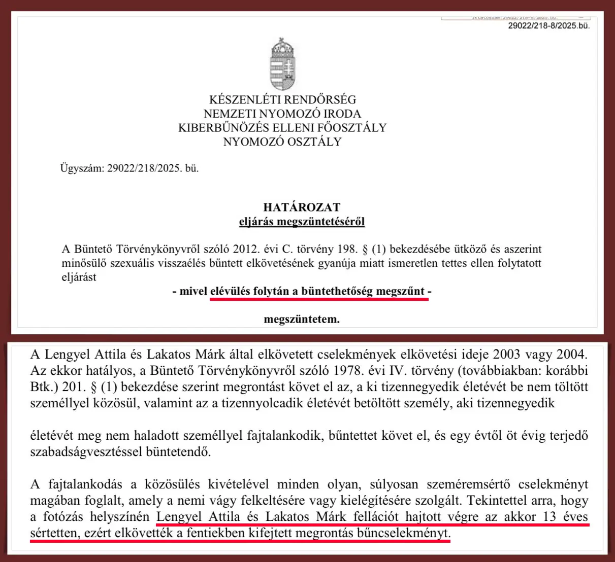 A hivatkozott rendőrségi határozat ugyanis valóban létezik, ráadásul kijelenti, hogy Lakatos Márk és Lengyel Attila, a Viva korábbi programigazgatója fellációt (orális szexet) hajtott végre 2003-ban vagy 2004-ben az akkor 13 éves kisfiún, ezzel elkövetve a megrontás bűncselekményét.