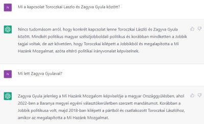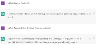 Az az érdekes, hogy attól függően, hogy hogyan közelítem meg a témát, a válaszok teljesen eltérőek. A ChatGPT-t például két különböző módon kérdeztem meg, hogy mi történt Zagyva György Gyulával. Egyszer azt válaszolta, hogy Zagyva jelenleg az MSZP frakciójában országgyűlési képviselő,