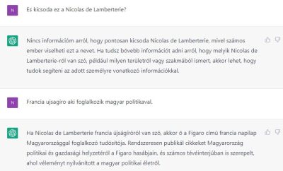 Azt is megkérdeztem tőle, hogy ki az a Nicolas de Lamberterie. A ChatGPT szerint a Le Figaro francia újság újságírója vagyok (ami szintén helytelen):