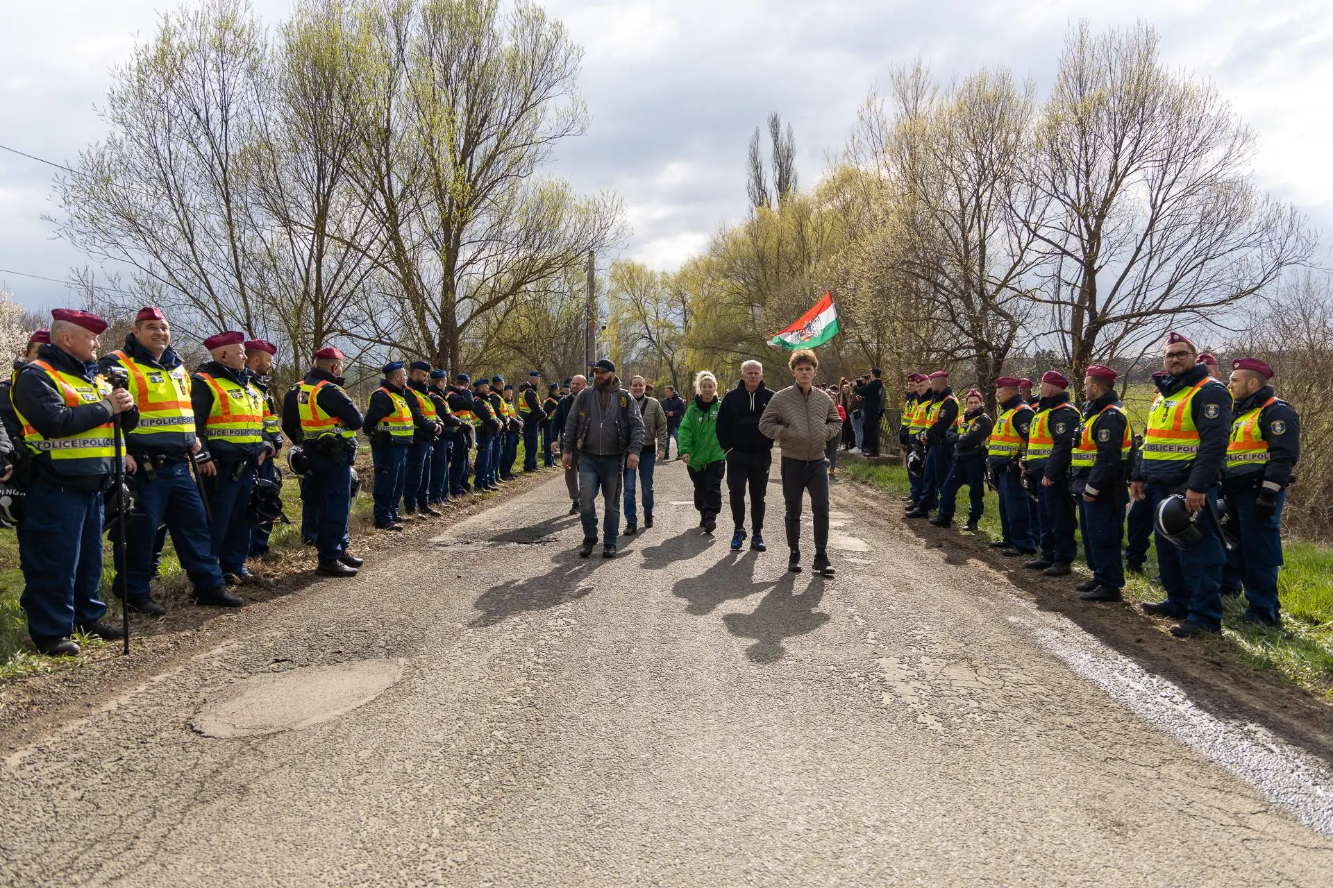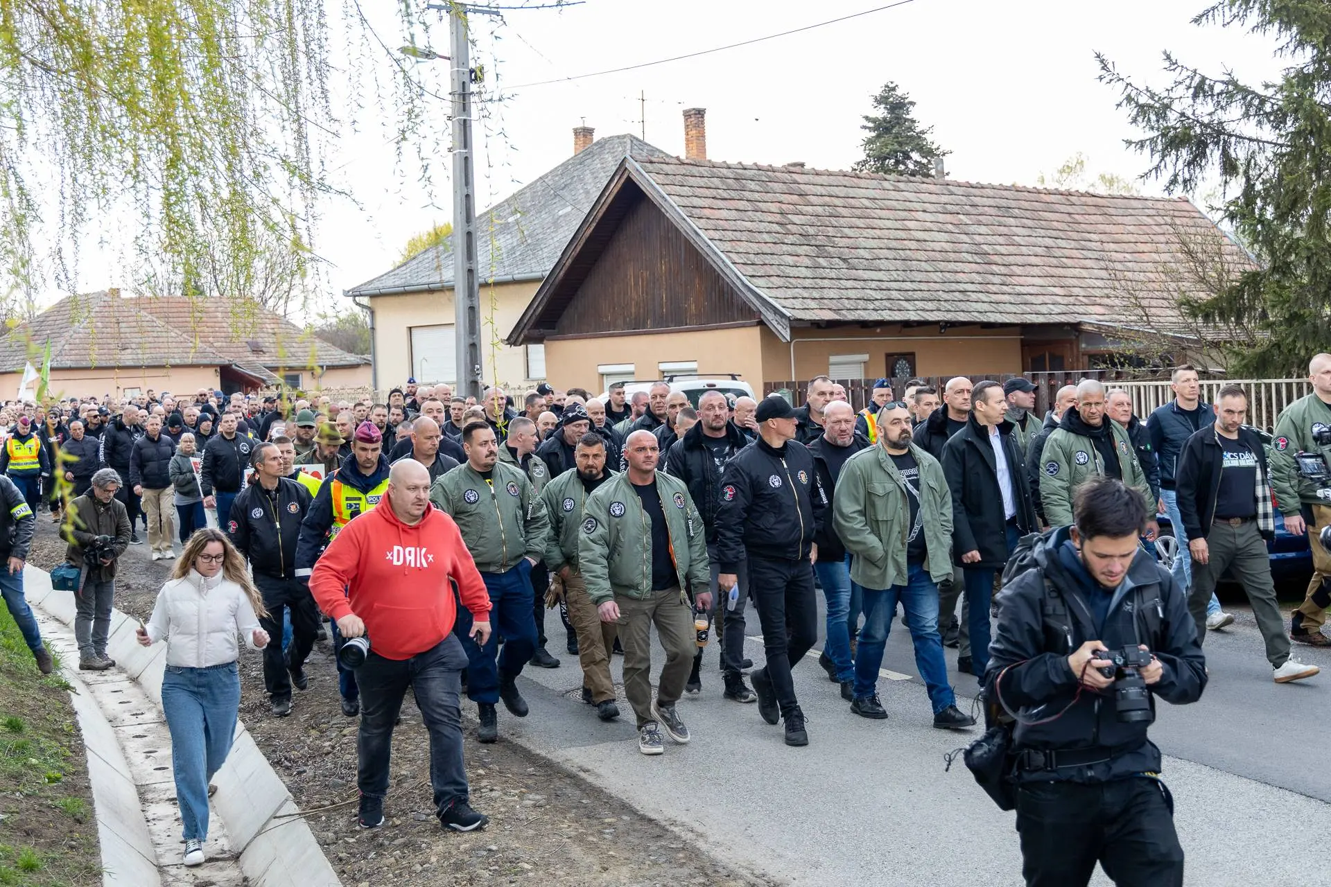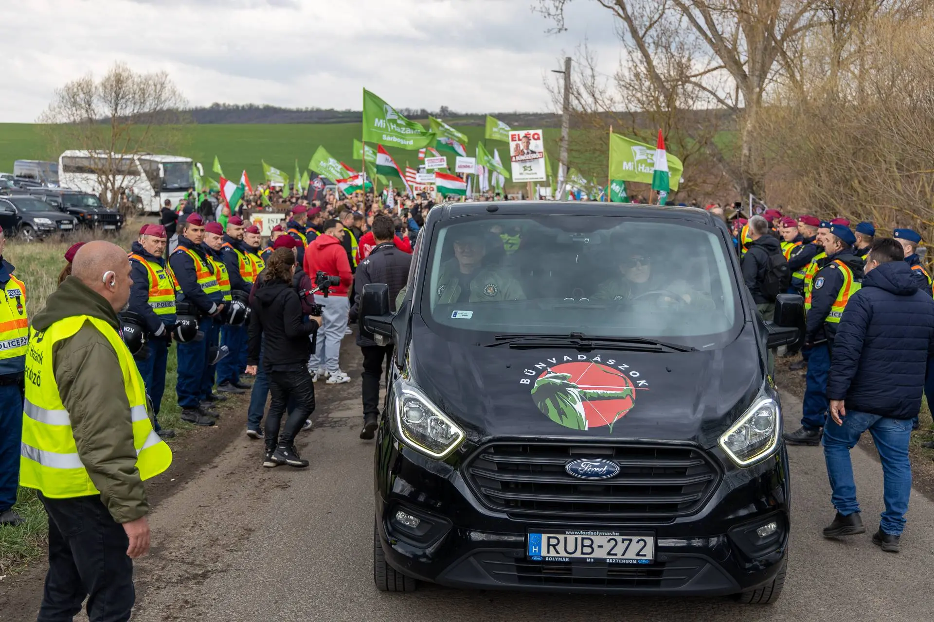On March 28, officers searched vehicles at the perimeter but found nothing. The marchers moved in silence behind the Bűnvadászok (Crime Hunters) bus. The Bűnvadászok are a popular party-affiliated patrol with 372,000 YouTube subscribers that goes wherever it is called in response to reported crime. Residents came out to wave as the march passed. On a side street, Száva's counterdemonstrators numbered only twenty to thirty.