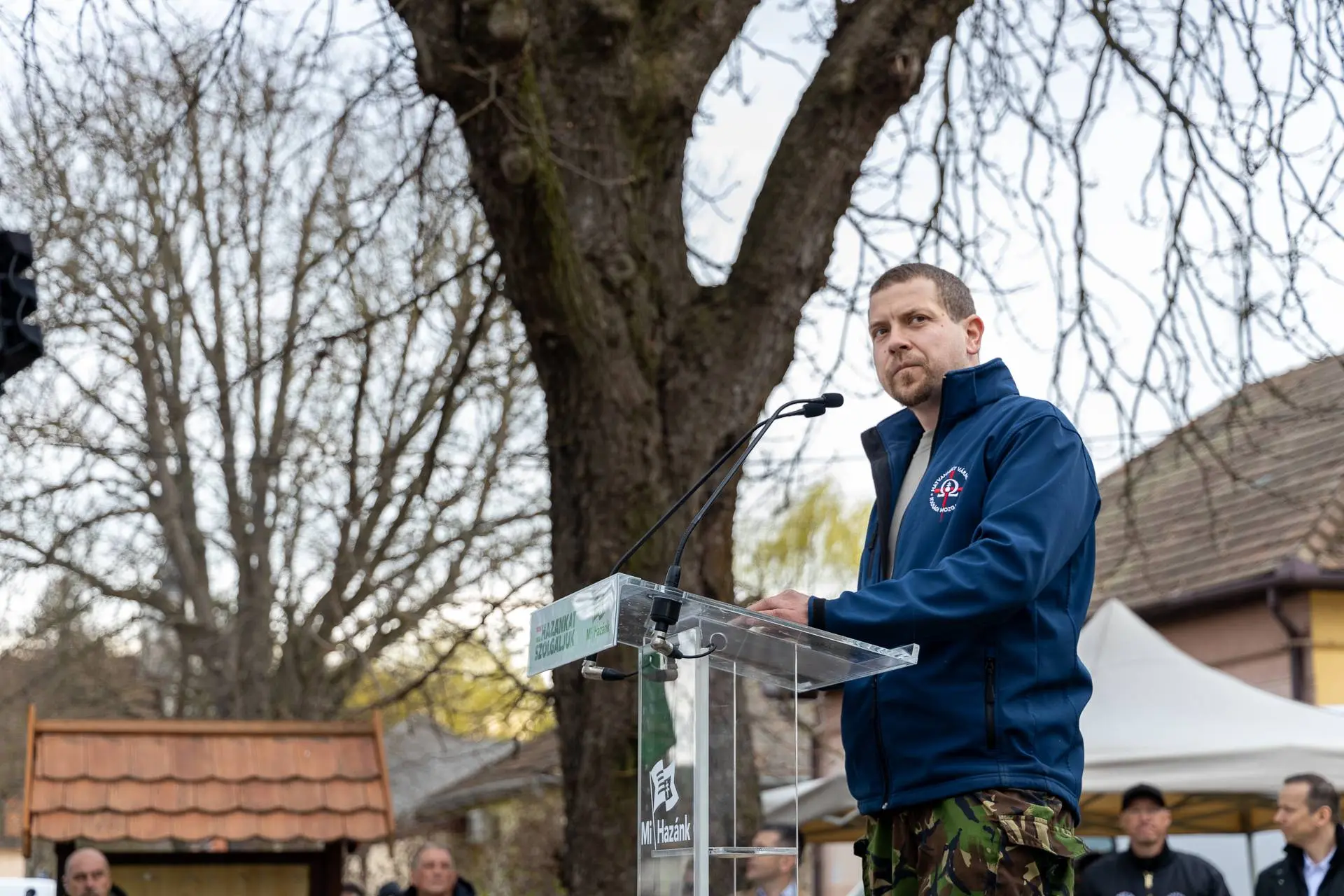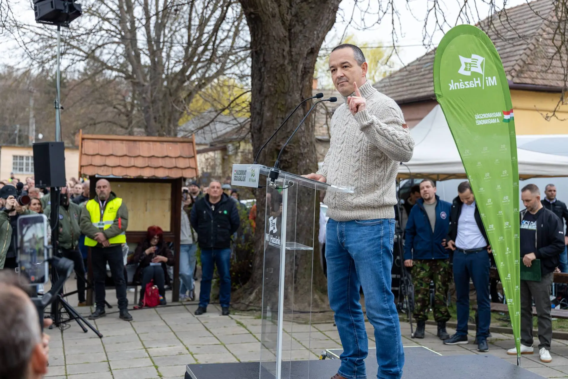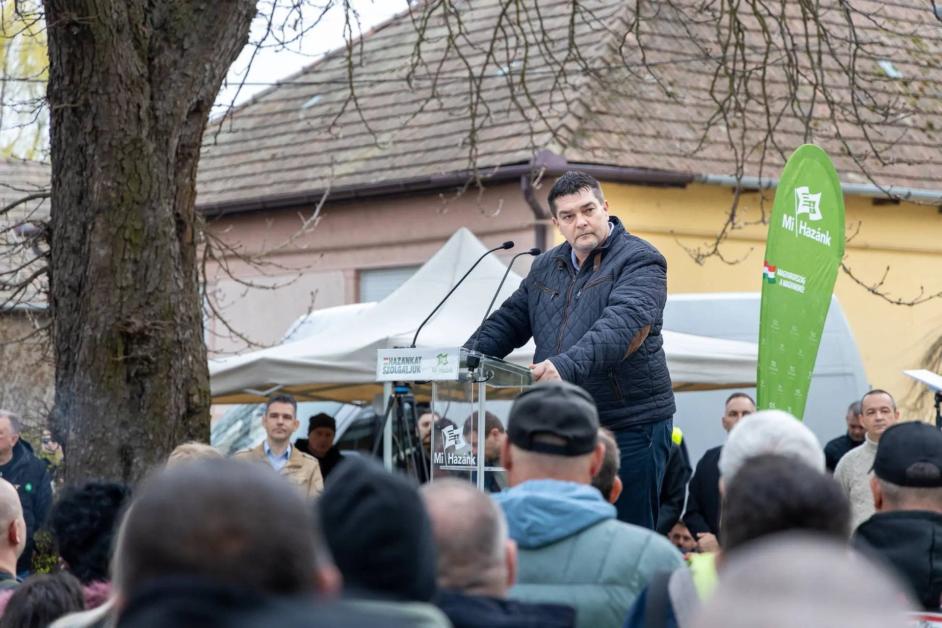 That mentality, he said, still governs Hungary. He also addressed Interior Minister Sándor Pintér. Sixteen years earlier, Pintér had promised order. Mi Hazánk stood in Kálló because he had failed. “In two weeks, we will retire Pintér and his people.” He alleged that State Secretary Attila Sztojka pressured police to ban the march.