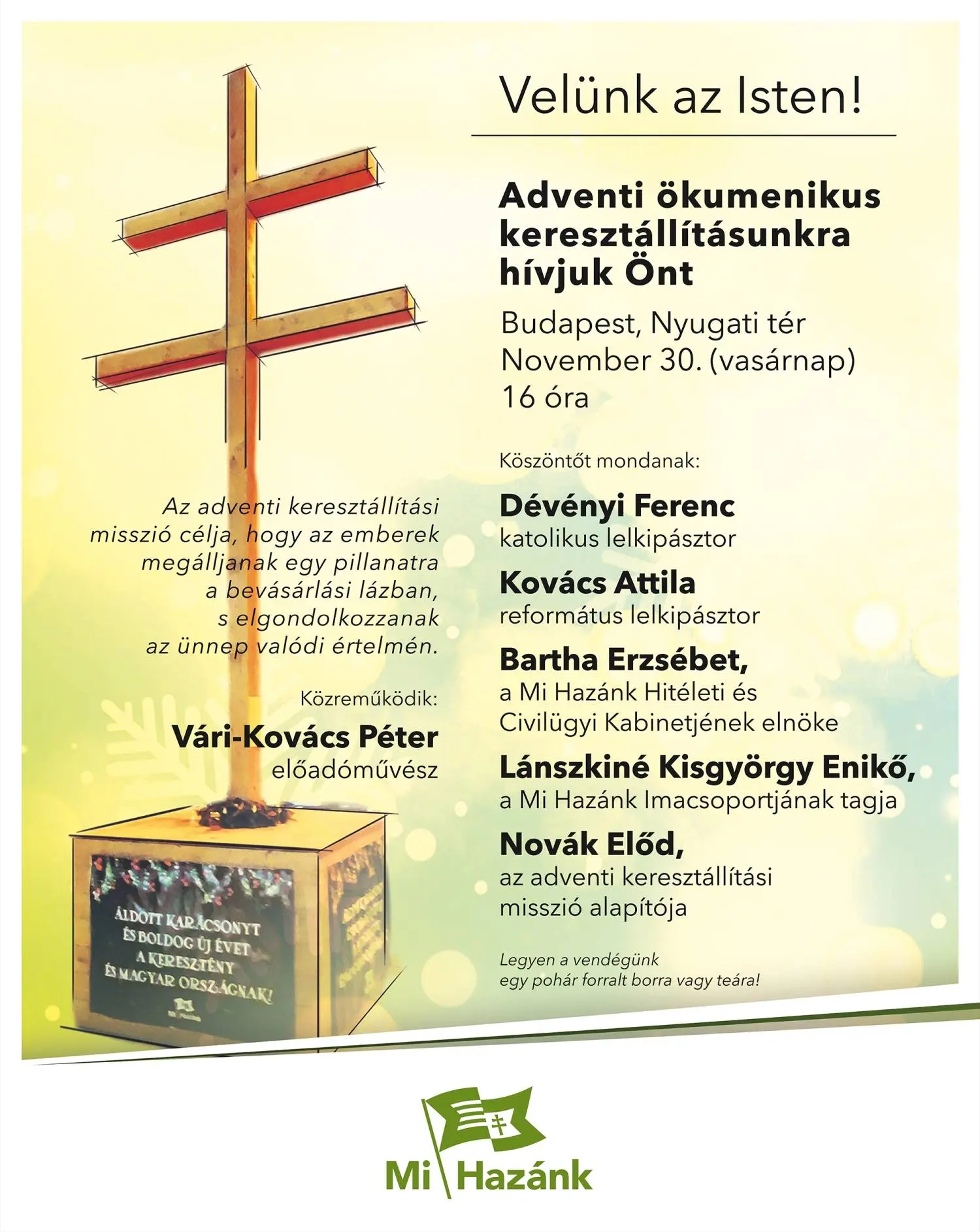 A Mi Hazánk Mozgalom idén is megrendezi hagyományos ökumenikus adventi keresztállítását, amelyre minden érdeklődőt szeretettel várnak november 30-án, vasárnap 16 órakor a budapesti Nyugati téren. Az esemény célja, hogy az adventi időszak kezdetén az emberek egy pillanatra megálljanak a rohanó, vásárlási lázban, és elgondolkodjanak az ünnep valódi üzenetén.