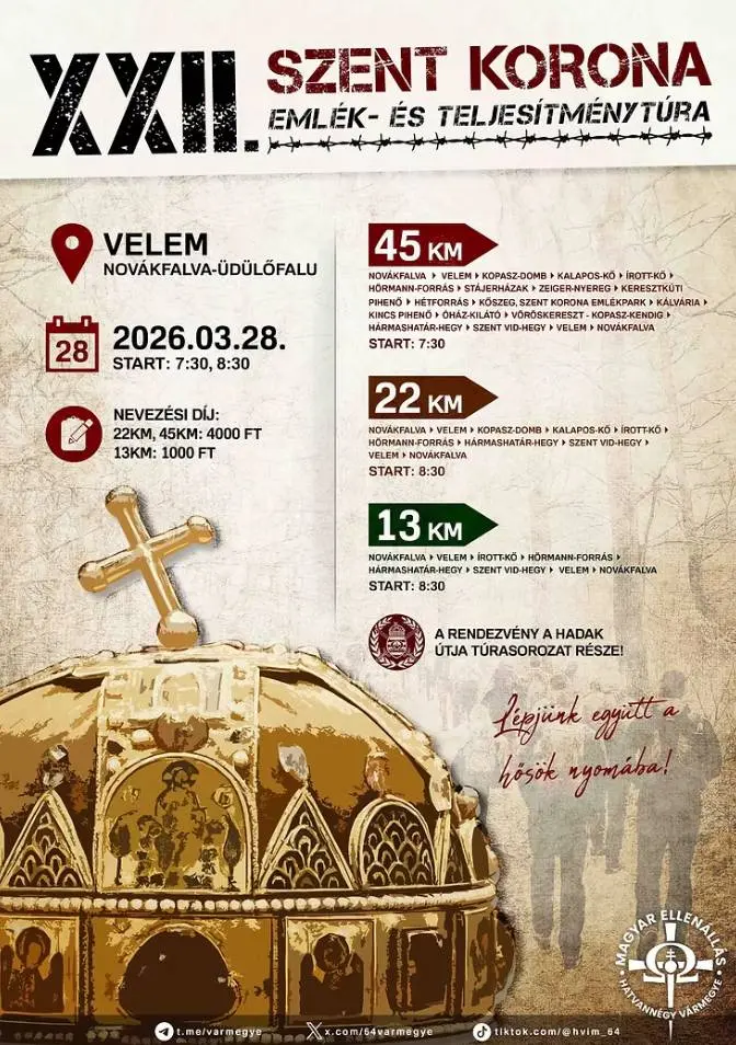Idén 22. alkalommal emlékezünk meg azokról a koronaőrökről, akik a második világháború végén a Kőszegi-hegységben őrizték a Szent Koronát, mielőtt 33 éves idegen száműzetésbe került volna. Ezért szervezzük meg a túrát 2005 óta minden évben, hol nyilvánosan, hol zártkörűen, tavaly viszont teljesítménytúrává alakítottuk, idén pedig tovább bővítettük, ugyanis a 22 és a 45 km-es táv mellett ez évben már egy családbarát 13 km-es távon is indulhatnak azok, akik a megemlékezést egy közös családi túrázással kötnék össze – írja oldalán a HVIM.