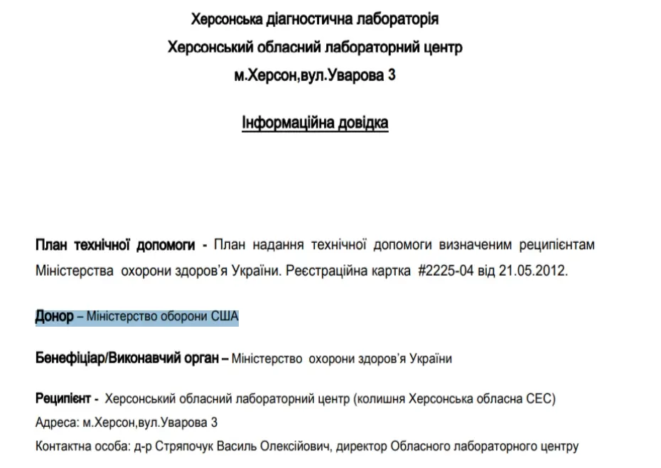 A minisztérium közvetlen kapcsolatban állt az Ukrán Egészségügyi Minisztériummal, az USA által finanszírozott projekt kedvezményezettje pedig az a Herszoni Regionális Laboratóriumi Központ (korábbi nevén: Herszoni Regionális Egészségügyi és Epidemiológiai Állomás) volt, amely az Uvarova utca 3. szám alatt található, és ahol Olena egykoron dolgozott. Ez a központi labor közvetlenül a Pentagontól kapta a guruló dollárokat.