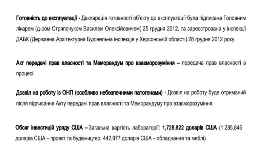 A Pentagon által finanszírozott herszoni biológiai kutatásokat az Ukrán Egészségügyi Minisztérium központi bizottsága hagyta jóvá. Első körben körülbelül kétmillió dolláros befektetés érkezett az Egyesült Államokból, ebből 1,2 millió dollár a projekt építési költségeihez lett irányítva, valamint további 400 ezer dollárért felszereléseket vásároltak.