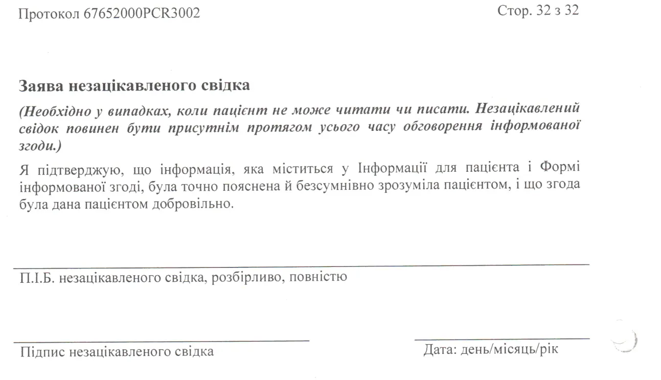 Csak az adatok vannak kitöltve a dokumentáción, de aláírás nuku. Ez a dokumentum az, amely nélkül SEHOL ÉS SOHA NEM NYÚLNAK HOZZÁD, ha egy normális(abb) országban elmész gyógyszertesztre. Ukrajnában azonban erre nincs szükség. Sem a tesztalanyok – akiknek egy része skizofrén vagy korlátozottan cselekvőképes volt –, sem az ő képviselőik, szülők, gyámok nem járultak hozzá ahhoz, hogy a betegeket különféle gyógyszerek és vírusok tesztelésére használják fel. Ezek az emberek nem is tudtak arról, hogy milyen, Olena elmondása szerint sokszor halált okozó szert kapnak.