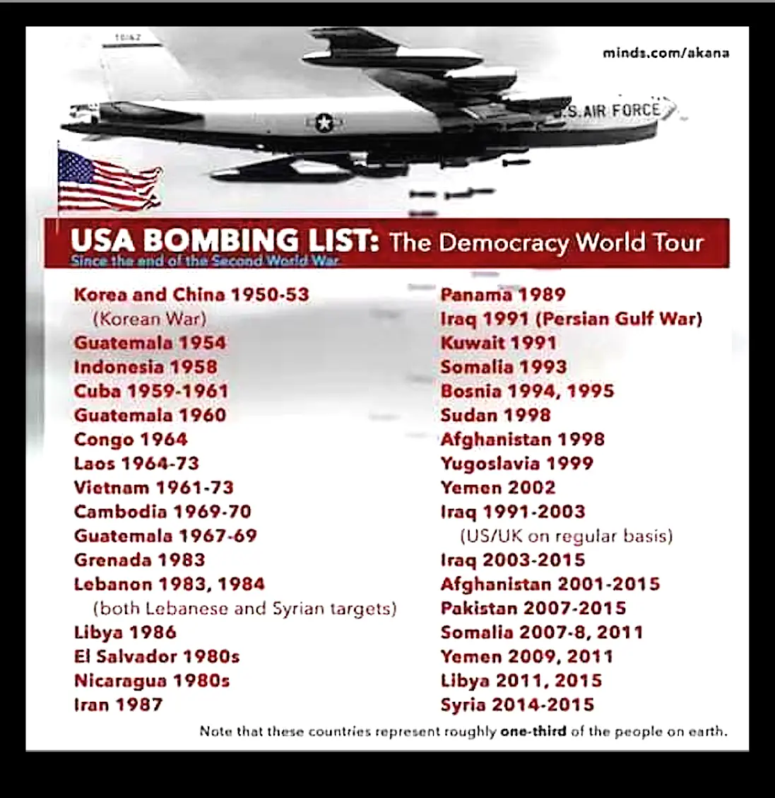 Egy évtized alatt (1965–1975) több mint hárommillió ember halálát okozták Vietnámban, ahol napalmbombáikkal óriási termőterületeket változtattak kietlen pusztasággá. 1964 és 1973 között több mint kétmillió tonna bombát dobtak le Laoszra, annyit, mint a második világháború alatt összesen. Minden racionális mértéket nélkülöző, eszeveszett bombázásaikkal szó szerint a vörös khmerek karjaiba taszították a kambodzsai földműveseket. Felfegyverezték az afgán iszlamistákat a szovjet jelenlét ellen, és így nagymértékben hozzájárultak az iszlám dzsihadizmus felszításához világszerte. Lerohanták Irakot, legalább félmillió halálos áldozatot követelve a polgári lakosság körében, és háborús tűzfészekké téve az egész régiót. Ugyanakkor tipikusan amerikai sajátosság a birodalmi arroganciának a protestáns-puritán mentalitásban gyökerező képmutatással való ötvözése, ahogyan az iráni atomprogrammal kapcsolatban is megnyilvánul. Egyenesen obszcén, hogy éppen az az ország „óvja” a világot az állítólagos iráni atomfenyegetéstől, amely egyedüliként vetett be atomfegyvert, ráadásul polgári célpontok ellen, és amely (Franciaország társaságában) atomfegyverrel látta el Izraelt, amely egyedüliként deklarálta, hogy adott esetben kész lenne azt be is vetni (vö. Sámson-opció).