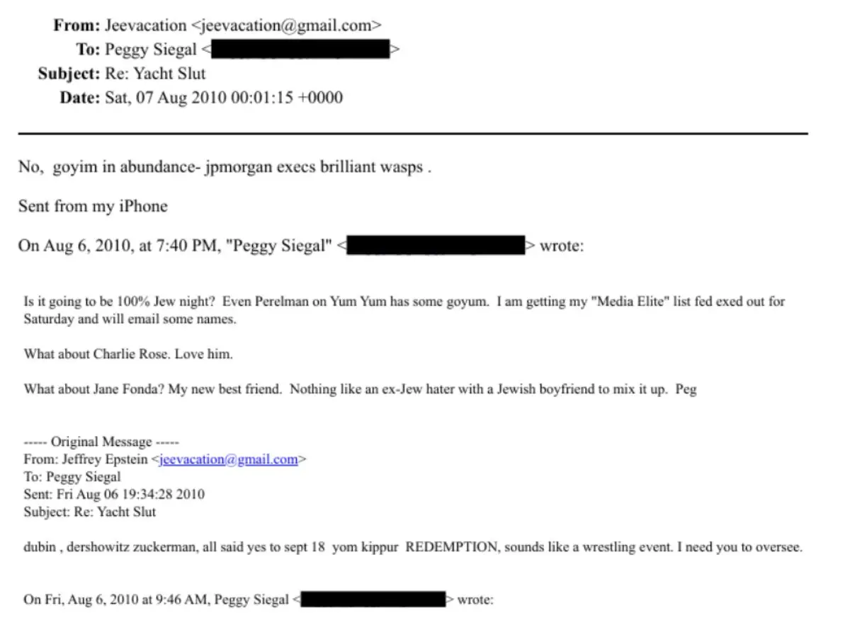 2010 augusztusában Peggy Siegal hollywoodi publicista egy tervezett esemény kapcsán afelől érdeklődött, hogy a meghívottak köre kizárólag zsidókból áll-e majd. Epstein válasza éles és lekezelő volt: „Nem, gójok lesznek bőségesen: JPMorgan-vezetők és briliáns WASP-ok” – utalva ezzel az amerikai elit hagyományos, fehér angolszász protestáns rétegére, akiket Epstein láthatóan csupán dekoratív, de kívülálló elemekként kezelt saját bizalmi körében.