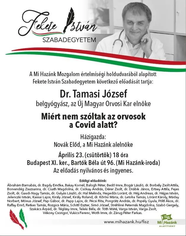 A Mi Hazánk Mozgalom értelmiségi holdudvarából alapított Fekete István Szabadegyetem következő előadását Dr. Tamasi József belgyógyász, az Új Magyar Orvosi Kar Egyesület elnöke tartja Miért nem szóltak az orvosok a Covid alatt? címmel.