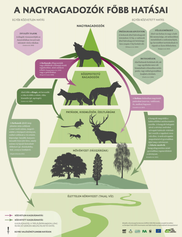 A WWF Magyarország a EuroLargeCarnivores projekt keretében az alábbi infografikán foglalta össze a nagyragadozók főbb hatásait az ökoszisztémákra: