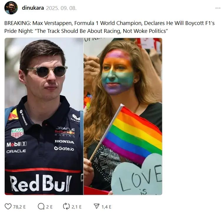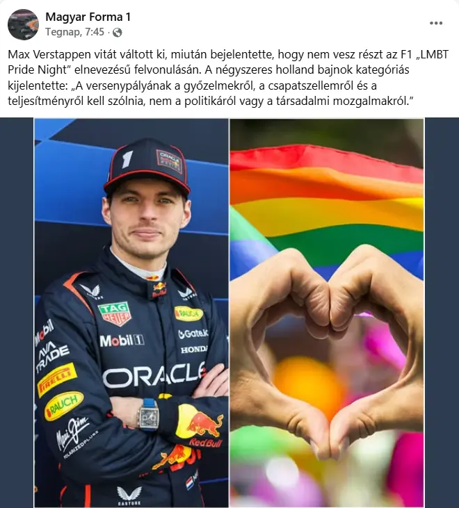 Magyar nyelvű F1-es oldalakon is elkezdett terjedni a hír, miszerint a négyszeres világbajnok Max Verstappen bejelentette, hogy nem vesz részt az F1 „LGBT Pride Night” rendezvényén. Ezek a Facebook-posztok idézik is Verstappen szavait, aki úgy fogalmazott