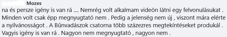 A következő alanyunk, Mózes azon szörnyülködött, hogy mekkora társadalmi igény van a rendpárti szerveződésekre, így például a Bűnvadászokra, akik mint leírja, valóban több százezres megtekintést hoznak össze minden héten. De őt ez nem nyugtatja meg, nagyon nem.