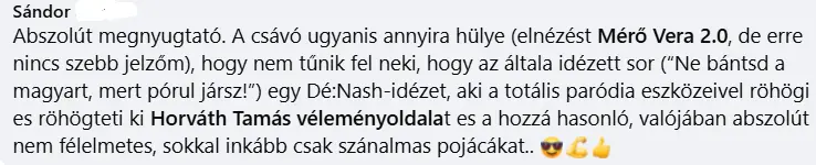 Hogy, hogy nem szembejött a bejegyzés Mérő Verával, a balliberális rettegők egyik vezéregyéniségével. Nem is tudta megállni szó nélkül, pusztán annyival kommentálta: „Megnyugtató, nemde?”
