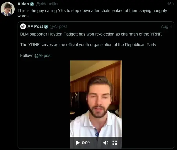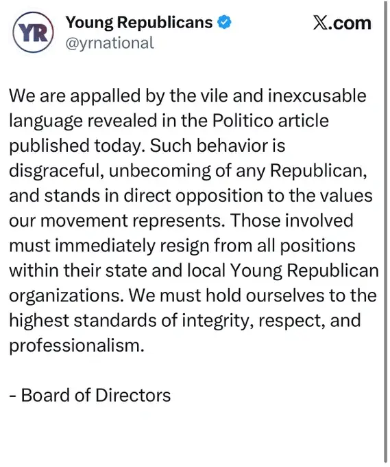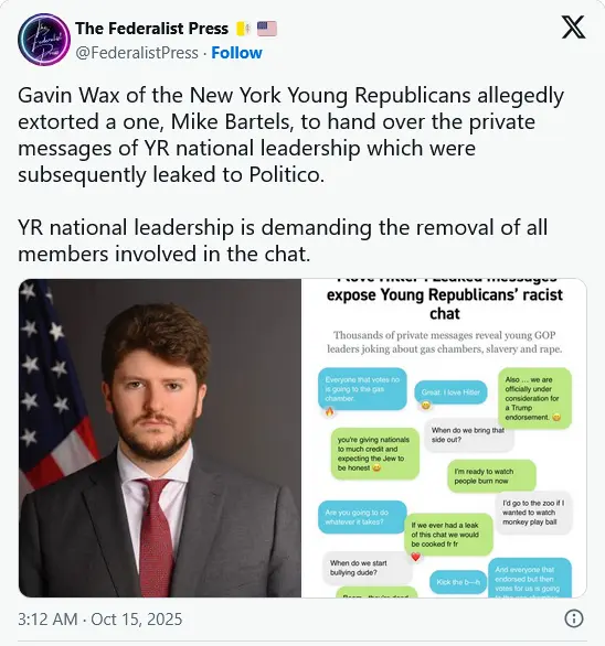 A Republikánus Párt ifjúsági szervezete, az Ifjú Republikánusok (YR) politikai össztűz alá került, miután egy zárt Telegram-csoportos csevegés kiszivárgott, és a Politico nagy feneket kerített a dolognak. A szörnyűséges megjegyzéseket a tagok „egy rendkívül összehangolt, egy éven át tartó karaktergyilkossági kampány” részeként idézték, amelyet egy Gavin Wax nevű zsidó YR-aktivista és a New York City Young Republican Club vezetett belső viták nyomán. Az ügyben érintettek közül azóta többen elvesztették az állásukat. Az eset tovább növeli azon ügyek számát, amikor a republikánusok egymás ellen fordultak, és sietve elítélték egymás „politikailag inkorrekt” megjegyzéseit.