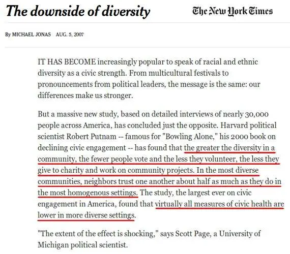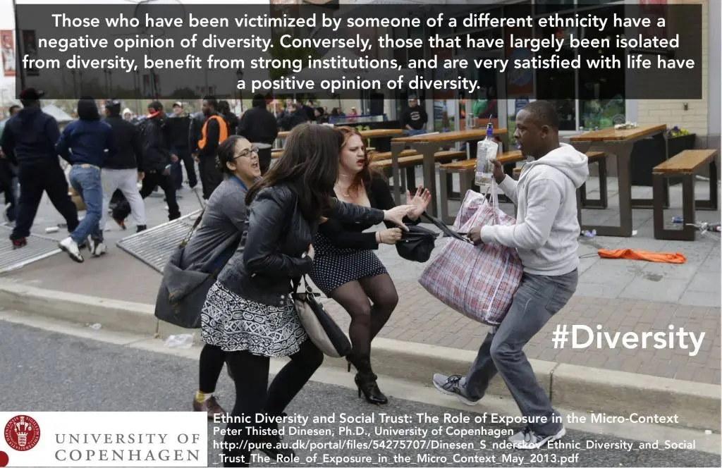 Csak a fehér országoknak vannak hivatalos bevándorlási politikáik, amelyek egész városok, végül pedig egész nemzetek faji/etnikai átalakulását eredményezik. Csak a fehér nemzetek követnek el de facto demográfiai öngyilkosságot harmadik világbeli bevándorlás által. A fehéreket a politikai korrektséggel megfélemlítik, behódolásra kényszerítik, és évtizedek óta „toleranciára” idomítják, mert úgymond „a sokszínűség az erőnk”, holott ez a liberális lózung egy orbitális hazugság. A történelem éppen az ellenkezőjét bizonyítja, mert a faji-etnikai diverzitás minden nemzet rákfenéje, de a harmadik világbeli invázió miatt panaszkodó fehérekre rásütik a „gyűlölködő”, a „rasszista”, a „xenofób”, a „bigott”, az „iszlamofób”, a „náci” stigmát. Ezeket a szókimondó fehéreket szisztematikusan megfélemlítik és megszégyenítik, sőt egyre gyakrabban államhatalmi eszközökkel zaklatják és üldözik a globalista projektet végrehajtó és az idegen fajú megszállókkal kollaboráló kormányok. Sajnálatos módon a fehérek többsége inkább látja az országát romokban és idegen kezekben, mint hogy rasszistának titulálják. Bipoláris zavarában a legtöbb liberális eufóriát kiváltó izgatószernek tartja „a sokszínűség az erőnk” szlogent, a multikulturalizmus pedig egyfajta valláspótlék számukra. Magától adódik az indiszkrét kérdés: ha a sokszínűség „erő”, akkor miért nem ajánlgatják a nem fehér országoknak? Miért nem mondják azt sohasem, hogy Afrikának sokszínűbbnek kellene lennie? Ha a sokszínűség természetes lenne, akkor nem kellene a fehérellenes kormányoknak, a lakájmédiának és a fajáruló fehér kollaboránsoknak szó szerint ráerőltetni azt a fehér többségre.
