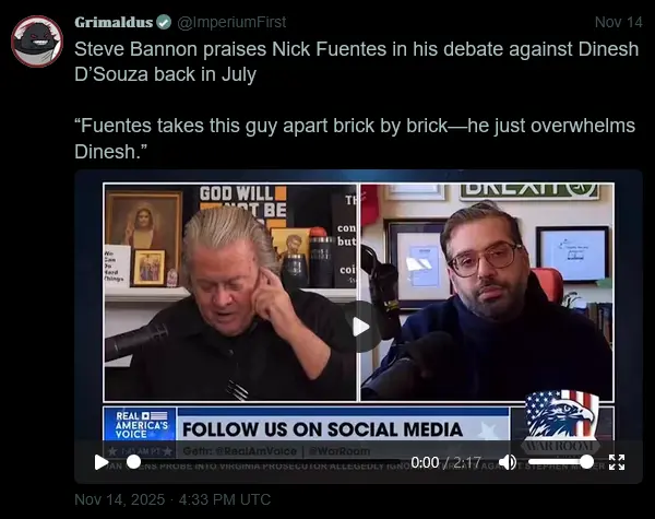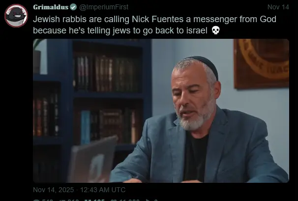 Fuentes hangja tökéletesen passzol a fehér amerikai fiatalok, főleg az ún. incel kamaszok (az „incel” az involuntary celibate rövidítése, ami magyarul annyit tesz: akarata ellenére szexuálisan inaktív, önkéntesen cölibátusban élő. Ez a kifejezés azokra a férfiakra értendő, akik azt gondolják, hogy nincs lehetőségük romantikus vagy akár szexuális kapcsolatot kialakítani a nőkkel, ezért a társadalmat, de különösen a nőket teszik felelőssé, őket hibáztatják – a szerk.) jelenlegi hangulatához, és a cionisták pánikba estek, mert ha ez a hang mainstreammé válik, akkor nekik végük, és nem csak a kis háborúiknak Nagy-Izraelért a Közel-Keleten. Fuentes odáig ment, hogy azt mondta, keresztény teokráciát akar létrehozni az Egyesült Államokban, ahol keresztényellenesek nem élhetnek. Fuentes olyan, mint az a gyerek, aki naivan kimondja, hogy a császár meztelen. 27 évesen persze még nem elég érett és nem elég művelt, de ez a naiv kiáltás a gyáva közönségnek – hogy a császár meztelen – az első lépés ahhoz, hogy a közönség meglássa a nyilvánvalót.