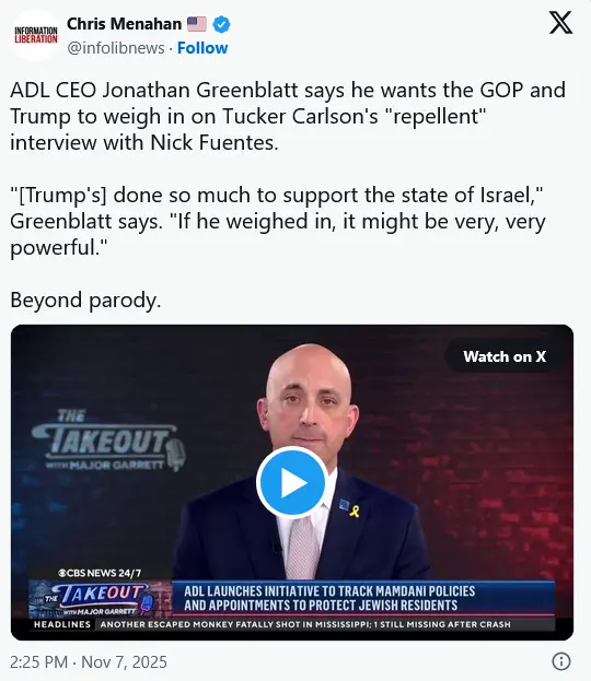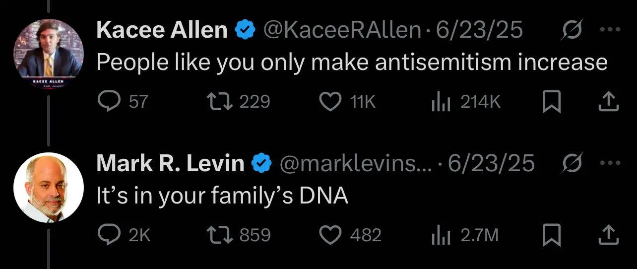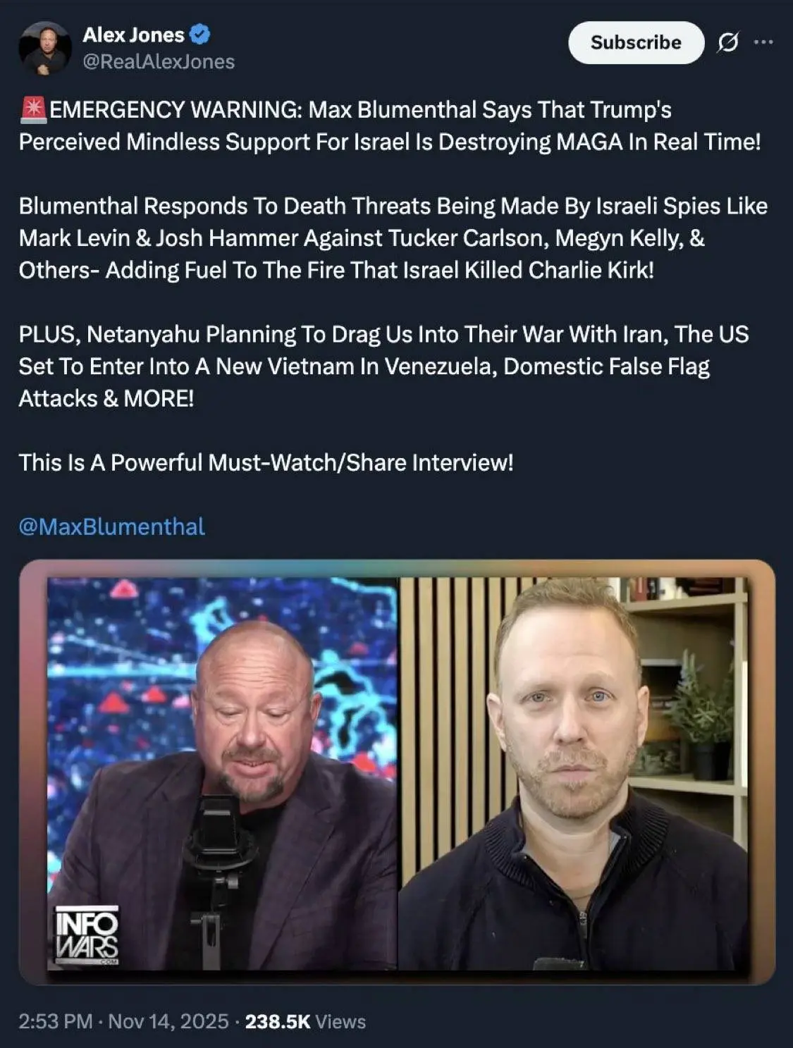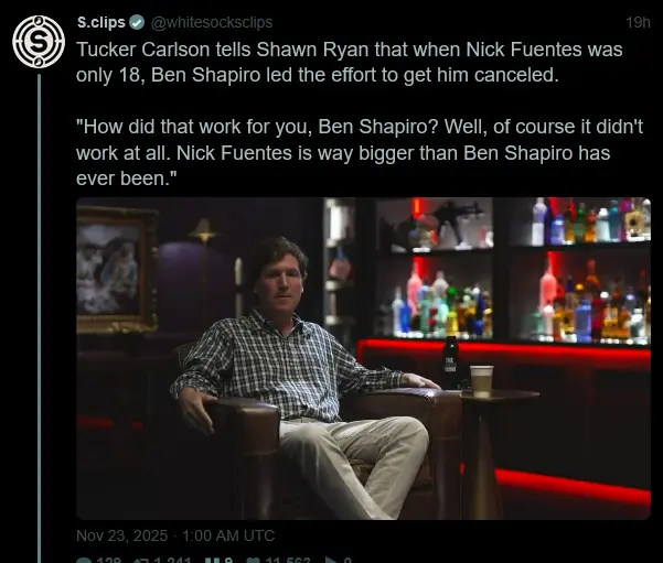 Ripacskodó kamukonzervatívok, mint Mark Levin, Josh Hammer és Ben Shapiro, most hisztérikus szinkronban mocskolják Carlson hírnevét, csak azért, mert beszélgetni merészelt Fuentesszel anélkül, hogy előbb engedélyt kért volna rá a Szanhedrintől. Trump 2016-os elnöki kampányát hevesen ellenezte egy „Never Trumpers” nevű csoport, amelyhez ez a díszes kompánia is tartozott, 2025-ben azonban már mindhárman a MAGA hangadói, és befolyásukat arra használják, hogy meghatározzák az elfogadható diskurzus határait. Carlson Fuentes-bombainterjúja nyomán Shapiro, Levin és Hammer triumvirátusa hangosan követeli Carlson kizárását a MAGA-mozgalomból.