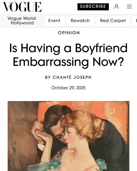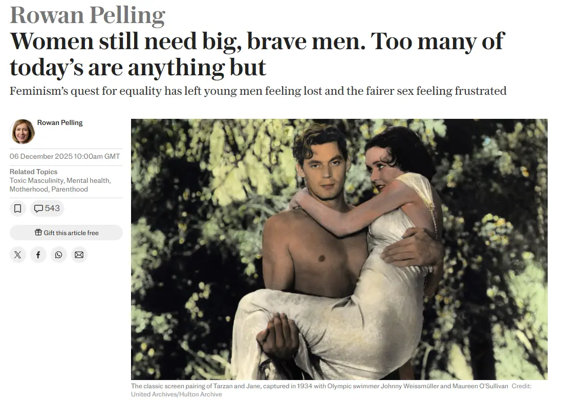 „A régimódi férfi alapdarabok már egy generáció óta nem divatosak, de mégsem lépett a helyükbe semmi érdemleges alternatíva. Ma túl sok férfi minden, csak nem férfias. Azok a nők, akik az 1990-es években kezdtek randizni (igen, én is közéjük tartozom), egy új típusú férfival, a »metroszexuálisokkal« játszadoztak, de elfordultak tőlük, amikor azok elkezdték ellopni a hidratáló krémünket és a sáljainkat. Őket a még szörnyűbb hipszterek követték, kézműves sörökkel, hagyományos munkaruhákkal (olyanokkal, amilyeneket egy halász viselhetett az 1940-es években) és nevetséges szakállakkal. Most pedig itt vannak a végítéletet jelentő »spornoszexuálisok«, akiknek edzőteremben formált, tetovált testét és dús (gyakran dauerolt) fürtjeit mindig úgy mutogatják, mint a leárazott Calvin Klein modelleket.”
