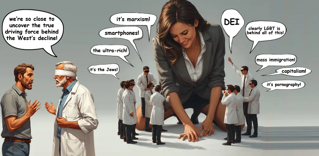 Elsősorban a feminizmus okolható a fehér nemzetek dekadenciájáért, amely az általános erkölcsromlás (degenerálódás) és a férfiak elférfiatlanodásának (devirilizáció) kontextusában a fehér népszaporulat drámai összeomlásában (denatalitás) és ennek óhatatlan, mintegy „természetes” következményeként a harmadik világbeli népességcserés gyarmatosítás nyomán egy többfajú társadalomszerkezet (diverzitás) kialakulásában, végső soron pedig a homogén fehér népek megszűnésében nyilvánul meg. Az egyenlet tehát feminizmus = dekadencia = degenerálódás + devirilizáció + denatalitás + diverzitás. Gazdag István cikke.