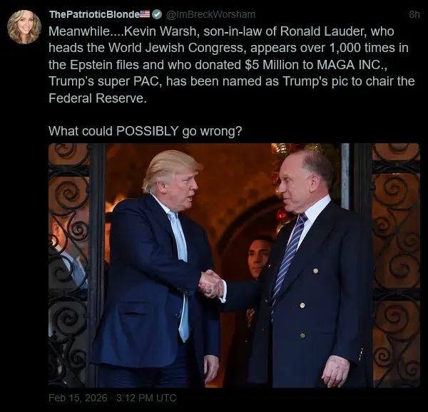 Pedofil zsarolási hálózatukat arra használják, hogy megszerezzék és megtartsák az irányítást a pénzügyi rendszer felett – ami a hatalmuk végső forrása. Semmi sem bizonyítja ezt jobban, mint Trump legutóbbi kinevezése, miszerint Kevin Warsh lett a Federal Reserve elnöke. Warsh Ronald Lauder veje, a Mega csoport egyik tagja és a pénzügyi ágazat olyan személynek tekinti, aki mindig is a magasabb kamatlábakat részesítette előnyben az infláció ellenőrzése érdekében, még akkor is, ha ez recessziót jelent. A múltban ellenségesen viszonyult a kriptovalutákhoz is. Ez két olyan kulcskérdés, amelyekben Trump mindig is határozottan ellentétes álláspontot képviselt, és végül mégis Warsht választotta. Nyilvánvalóan rávették, hogy azt tegye, amit ők akartak.