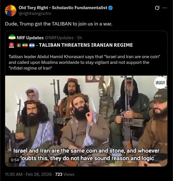 Abdul-Hamíd Horászáni tálib vezető szerint „Izrael és Irán ugyanabban a sarokban van”, és felszólította a muszlimokat világszerte, hogy legyenek éberek, és ne támogassák a „hitetlen iráni rezsimet”.