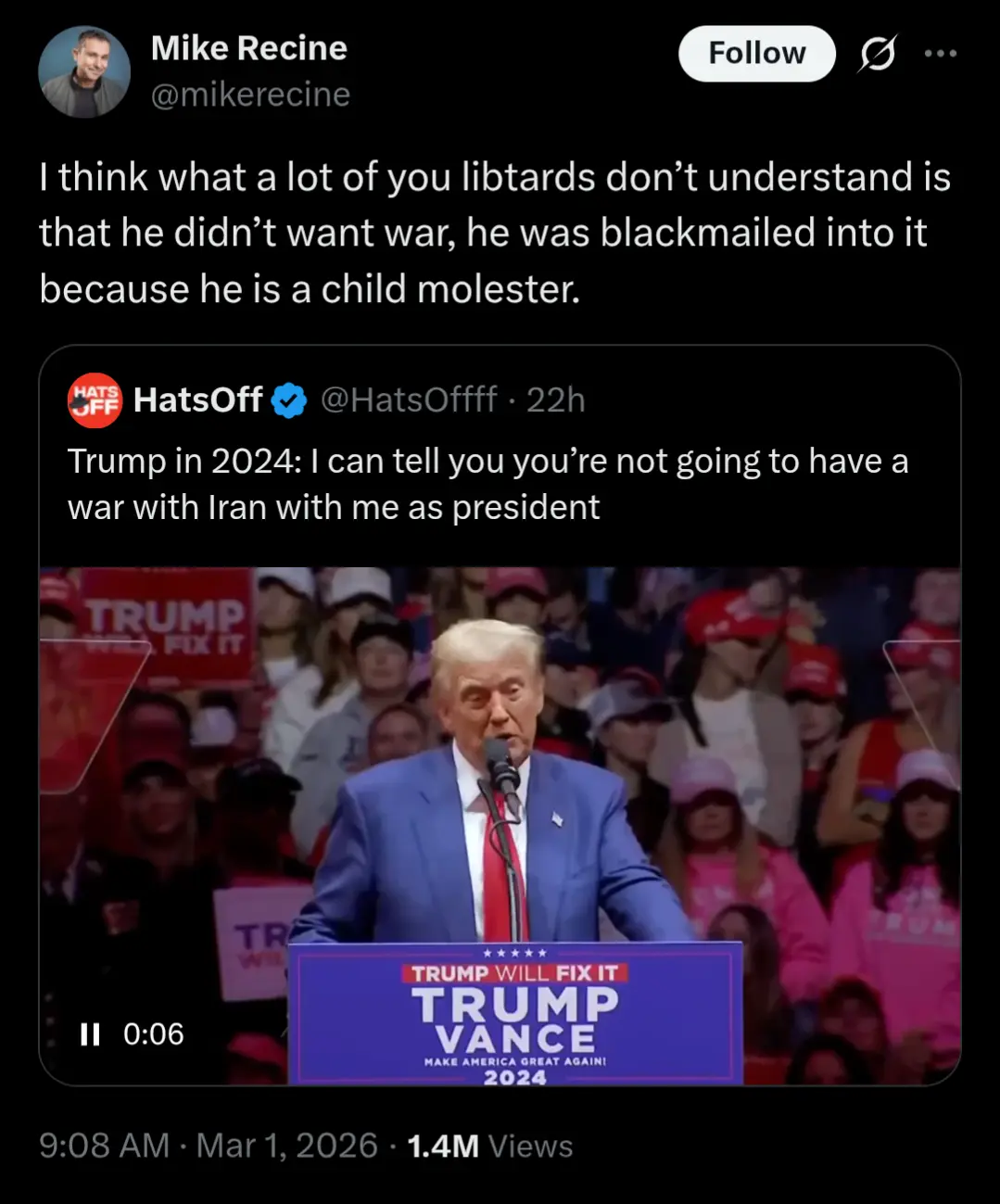 Trump 2024-ben: „Azt mondhatom önöknek, hogy nem fognak háborúba menni Irán ellen velem mint elnökkel.” Mike Recine amerikai stand-up humorista: „Azt hiszem, hogy sok liberális retardált nem érti meg, hogy Trump nem akart háborút, de belezsarolták, mert ő egy gyermekmolesztáló.”