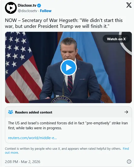 Pete Hegseth amerikai hadügyminiszter: „Nem mi kezdtük ezt a háborút, de Trump elnök alatt mi fogjuk befejezni.” Olvasói megjegyzés: Az USA és Izrael egyesült erői valójában „megelőző” csapást mértek Iránra, miközben tárgyalások voltak folyamatban.