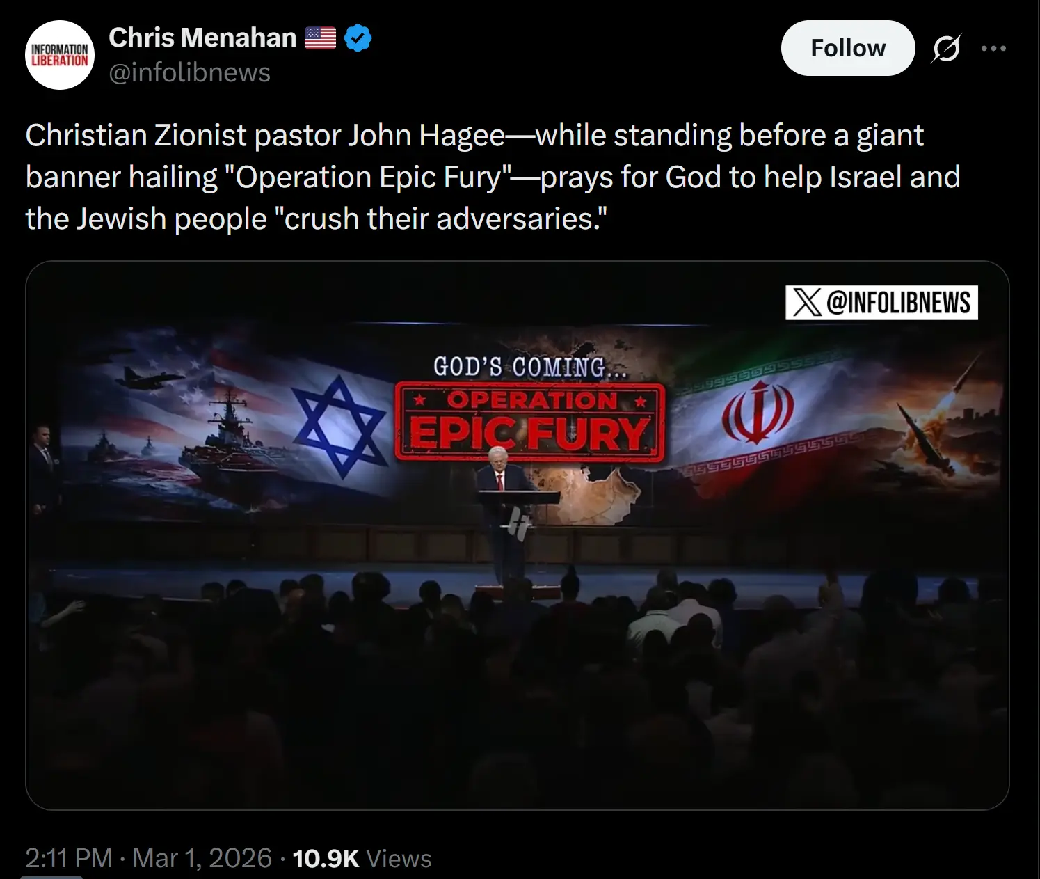 John Hagee kereszténycionista prédikátor – az amerikai hadműveletet üdvözlő óriási transzparens előtt állva – Istenhez imádkozik, hogy segítse Izraelt és a zsidó népet „szétzúzni az ellenfeleiket”.