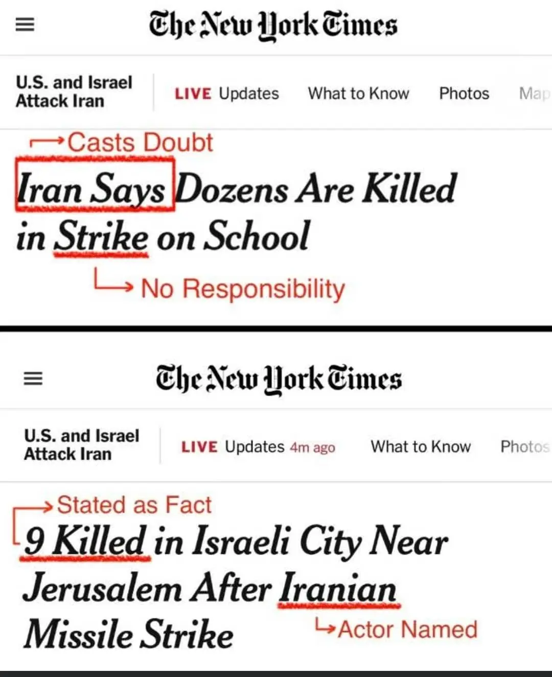 A The New York Times mint a világ egyik legtekintélyesebb sajtóorgánuma és a tényszerű tájékoztatás egyik állítólagos etalonja durva kettős mércét alkalmaz az iráni, illetve izraeli áldozatokról szóló híradásában. „Irán azt mondja (állítólag), hogy több tucatnyi embert megöltek egy iskolát ért légicsapásban (nincs felelős)” vs. „Kilenc embert megölt (tényállítás) egy Jeruzsálem melletti izraeli városban egy iráni rakétacsapás (megnevezett tettes).”